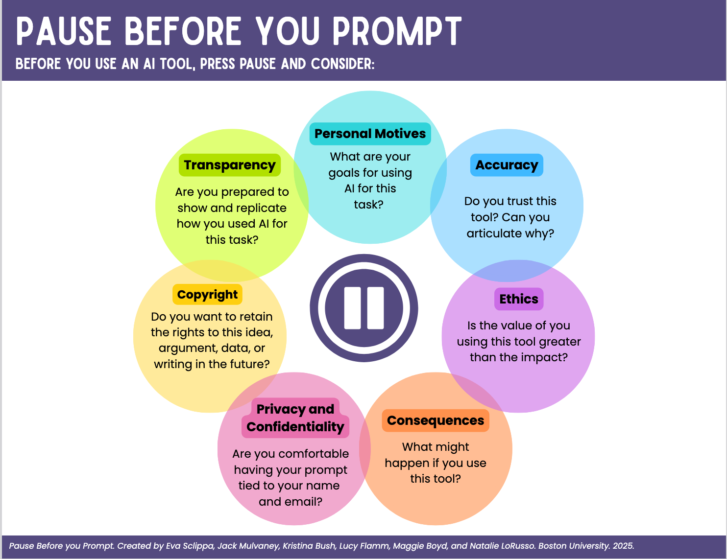 We didn’t initially have the idea of a “pause” in our minds. We all agreed that we aspired for students to be intentional and informed about their usage, with a clear sense of their motivations and potential outcomes. We discovered along the way that pausing was a useful framing to capture this goal, especially in contrast to the emphasis on acceleration pervading AI discourse. As more tech companies push us to outsource more of our cognitive tasks, flooding the market with promises of newer and better outputs, we consider ‘pausing’ an act of resistance.